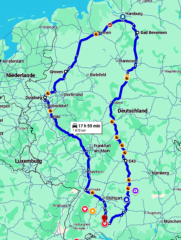 Sigmaringen → Ulm → Würzburg → Fulda → Bad Bevensen → Greven → Duisburg → Koblenz → Karlsruhe → Sigmaringen